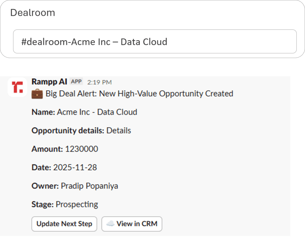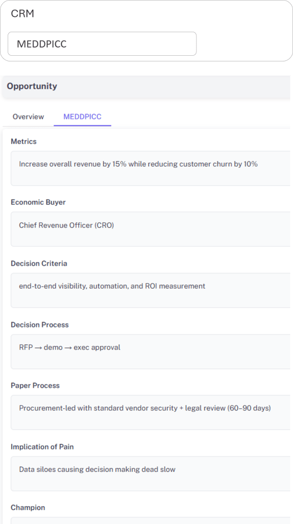 Turn deal qualification into a living system, not a checklist. Rampp.ai continuously updates MEDDPICC—Metrics, Economic Buyer, Pain, Paper Process, Champion—so forecasting becomes science, not storytelling.